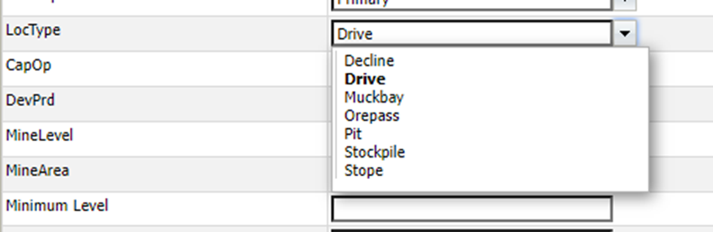 For Example: “LocType” Fields in the .csv must always read: DECLINE, DRIVE, MUCKBAY, OREPASS, PIT, STOCKPILE, or STOPE