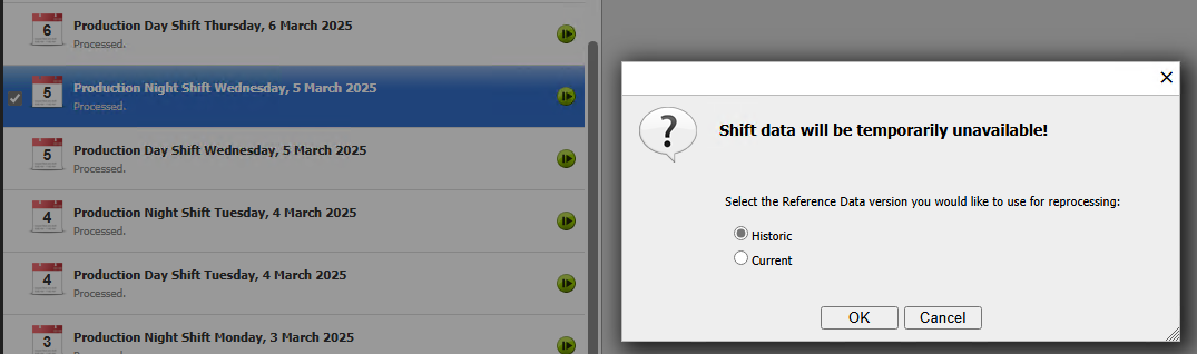 | Historic | If Historic is selected, by default, the last reference data version used within that particular shift is used |