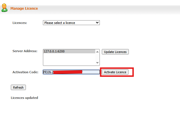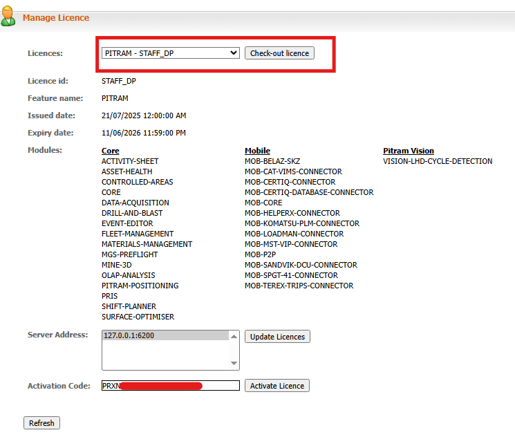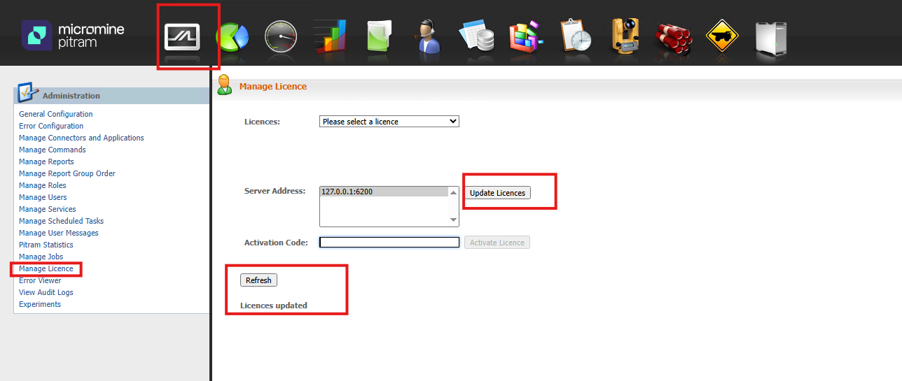 Click on update Licence which will be the server address of the server which Pitram Licence Service is running on. In this case it is the same server as the Micromine Network Licence Server. The default port is 6200.