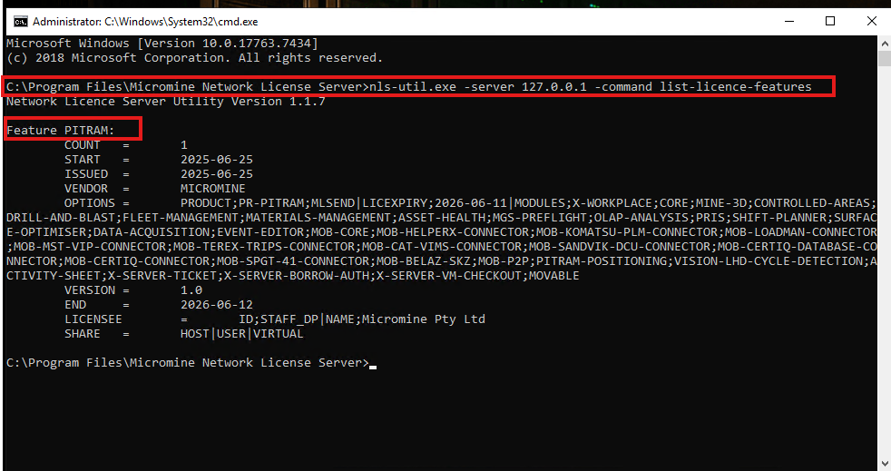 nls-util.exe -server 127.0.0.1 -command return-licence-features MICROMINE
