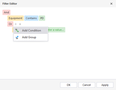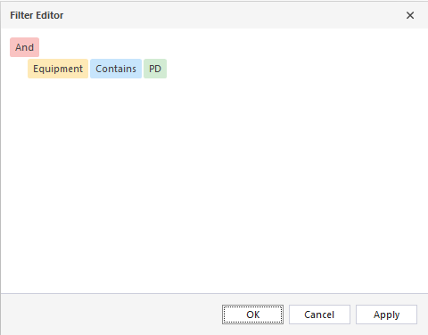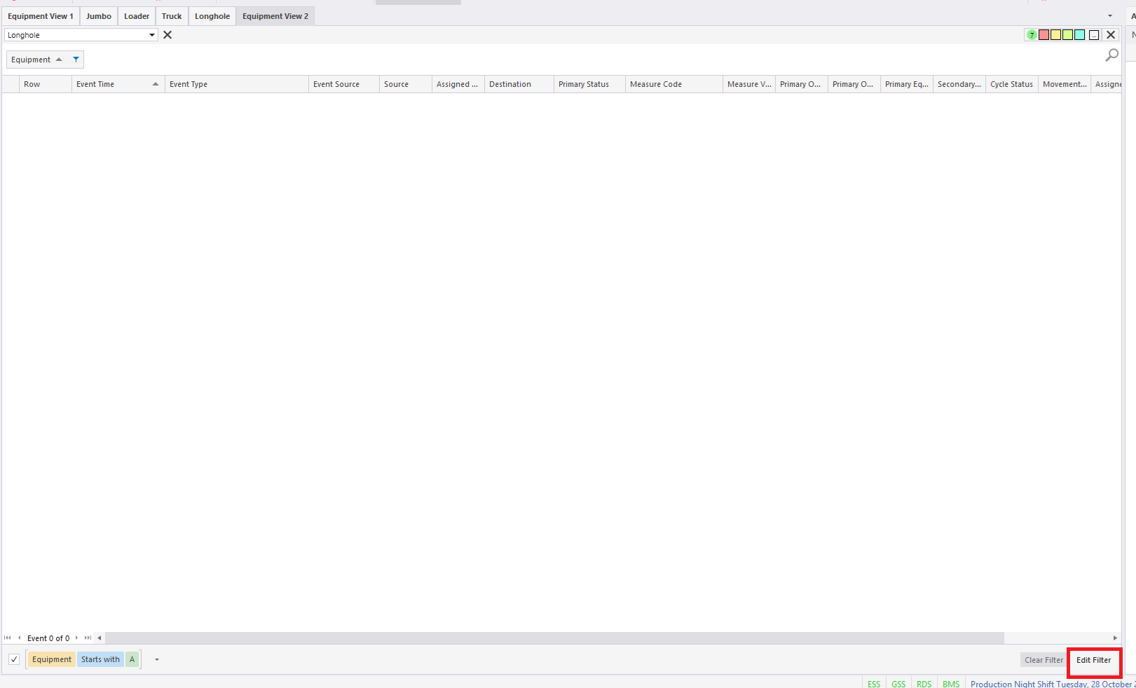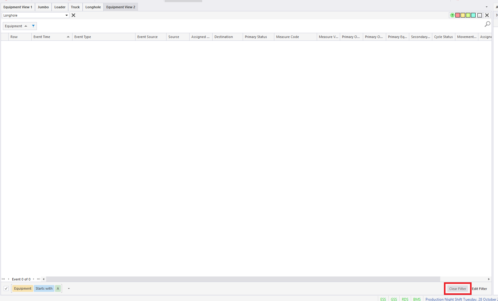 Here we will filter the equipment. For the yellow box choose equipment, the blue box you can either choose Begins with or contains. Then in the green box type the required letters. In my example, I have two Longholes called "Auto_PD001" and "Auto_PD002" so I am selecting equipment contains "PD".