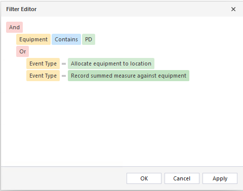 Equipment Contains "PD" AND Event Type is Allocate to location OR Event Type is Record Summed measure against equipment.