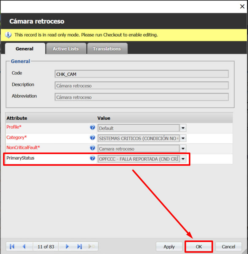 - El estado principal de equipo al cual se va a registrar en automático para los elementos del checklist en "Con falla"